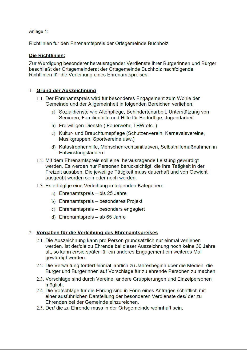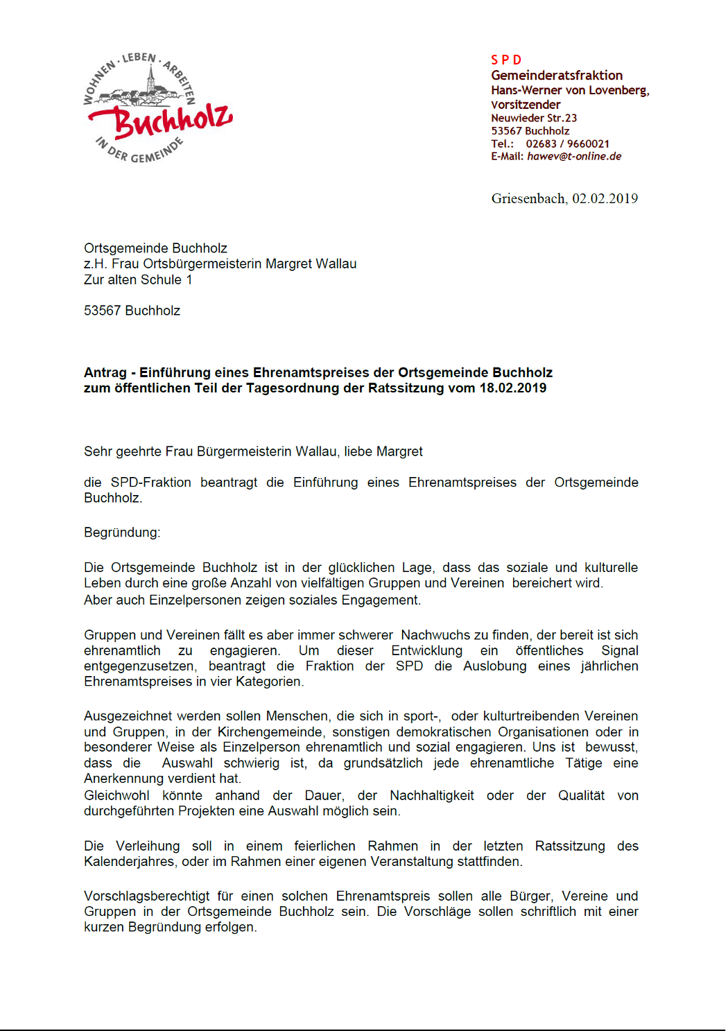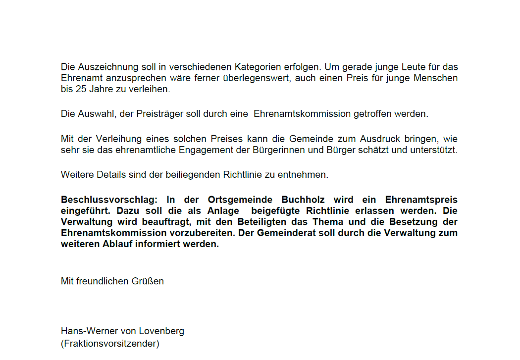 Buchholz ist auch deshalb so lebenswert, weil es durch ein sehr vielfältiges Vereinsleben bereichert wird. Leider muss festgestellt werden, dass es Vereinen teilweise immer schwerer fällt Personen zu finden, die bereit sind sich in der Freizeit ehrenamtlich zu engagieren. Dem möchten wir ein öffentliches Signal entgegenstellen und das Ehrenamt aufwerten und würdigen. Wir hoffen, dass sich CDU und FWG im Rat unserem Antrag anschließen können und es bereits in diesem Jahr zur ersten Verleihung kommen kann.